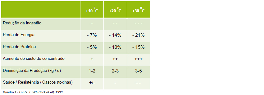 No quadro abaixo estão descritos os efeitos que podem ser observados quando a silagem apresenta uma temperatura de 10, 20 ou 30ºC acima da temperatura de referência.