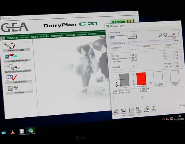A ordenha dá a produção diária de cada animal, velocidade de descida do leite, tempo de ordenha de cada animal, e a condutividade que permite perceber